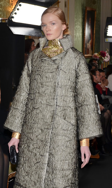- Excesos: Una pechera dorada metálica a modo joya con un pantalón sastre o mitones de raso con un vestido de noche, puede estar guay (aunque Céline ya nos lo enseñó); pero no poner todo junto cómo paso en algunos looks que juntaba: levita, cuello de pelo, con unas gafas, unos mitones y ademàs un bolso gigante de cocodrilo.
